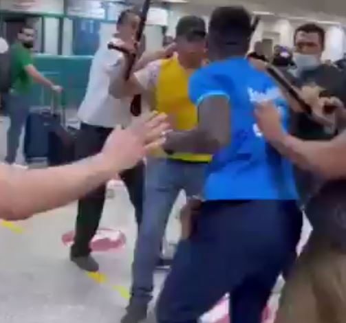 La vidéo est devenue virale sur les réseaux sociaux. Elle choque et ne laisse personne indifférent. On y aperçoit un passager noir en transit battu sauvagement  à l’aéroport  de ce pays par une horde d’agents de police et du personnel.