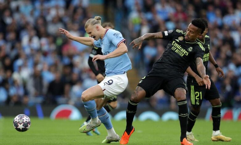 17th May 2023; Etihad Stadium, Manchester, England; Champions League Football, Semi Final Second Leg, Manchester City versus Real Madrid; Eder Militao of Real Madrid trips Erling Haaland of Manchester City – Photo by Icon sport