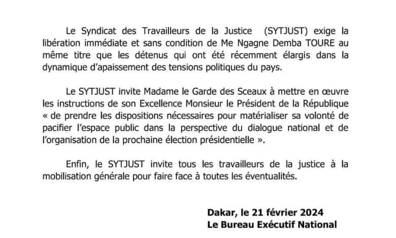 Le syndicat des travailleurs de la justice(SYTJUST) exige la libération de Me Ngagne Demba Touré.