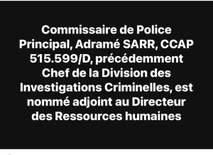 ‹ Commissaire de Police Principal, Adramé SARR, CCAP 515.599/D, précédemment Chef de la Division des Investigations Criminelles, est nommé adjoint au Directeur des Ressources humaines ;
