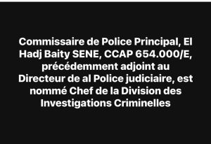 * Commissaire de Police Principal, El Hadj Baity SENE, CCAP 654.000/E, précédemment adjoint au Directeur de al Police judiciaire, est nommé Chef de al Division des Investigations Criminelles ;