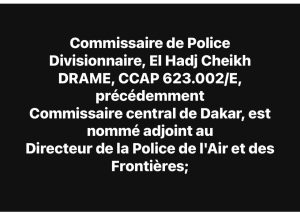 * Commissaire de Police Divisionnaire, El Hadj Cheikh DRAME, CCAP 623.002/E, précédemment Commissaire central de Dakar, est nommé adjoint au Directeur de la Police de l’Air et des Frontières ;