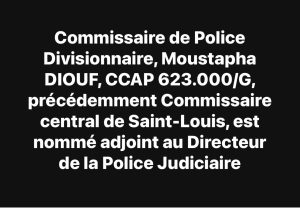 * Commissaire de Police Divisionnaire, Moustapha DIOUF, CCAP 623.000/G, précédemment Commissaire central de Saint-Louis, est nommé adjoint au Directeur de la Police Judiciaire ;