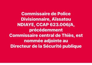 * Commissaire de Police Divisionnaire, Aïssatou NDIAYE, CCAP 623.006/A, précédemment Commissaire central de Thiès, est nommée adjointe au Directeur de la Sécurité publique ;