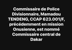 ‹ Commissaire de Police Divisionnaire, Mamadou TENDENG, CCAP 623.001/F, précédemment en mission Onusienne, est nommé Commissaire central de Dakar ;