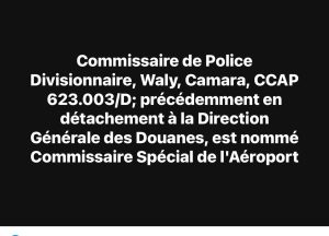 Commissaire de Police Divisionnaire, Waly, Camara, CCAP 623.003/D; précédemment en détachement à al Direction Générale des Douanes, est nommé Commissaire Spécial de l’Aéroport ;